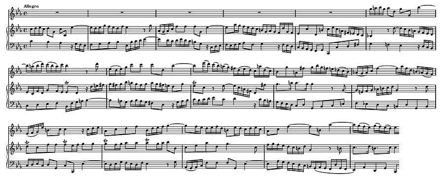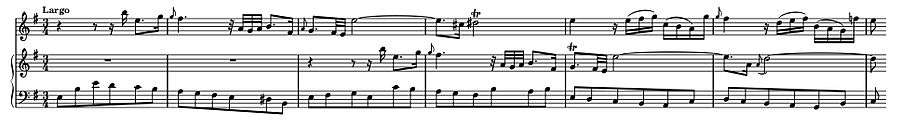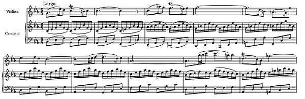 The Largo starts off with a simple walking bass in the harpsichord which for the first three bars is annotated as a figured bass. The violin enters with the theme which is imitated in canon by the upper harpsichord part two bars later. The second complete statement of the theme is in the harpsichord with the canon in the violin, which passes into its "noble" lower register playing an expressive descending sequence of long sustained notes in suspension. It is during this passage that the third middle voice is first heard in the harpsichord playing semiquavers which dovetail with those of the main theme in the harpsichord, the combination of parts developing into a semiquaver accompaniment.