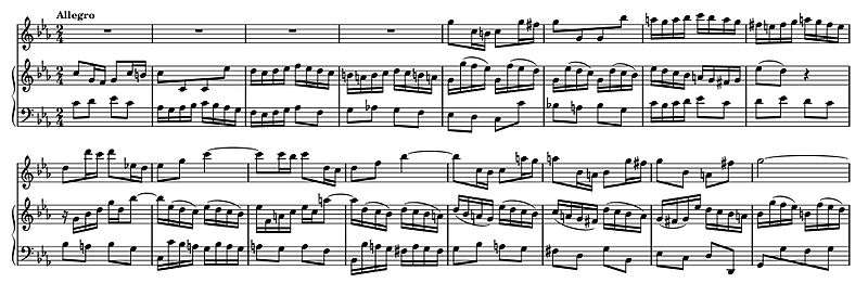 The opening movement is a concerto allegro in G major and common time. This already sets the sonata apart from the previous sonatas, which like the sonatas da chiesa of Corelli start with slow movements: BWV 1019, like the instrumental concertos of Bach, begins with a fast movement. Symmetrical in structure and written in strict da capo form, its opening 21 bar ritornello is scored as a tutti section for all three parts. The toccata-like semiquaver theme descending in the violin is matched by a rising quaver countersubject in the upper keyboard, with a rhythmic quasi-continuo in the bass line. The upper voices are written in invertible counterpoint in the ritornello, with the musical material alternating every two or four bars. The semiquavers continue unabated like a moto perpetuo throughout the ritornello, passing from one voice to another. After the first eight bars, when the main theme is heard twice, there is an eight-bar interlude when the violin and upper keyboard play in counterpoint, alternating between semiquaver motifs derived from the main theme and a syncopated countersubject.