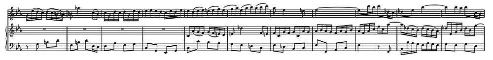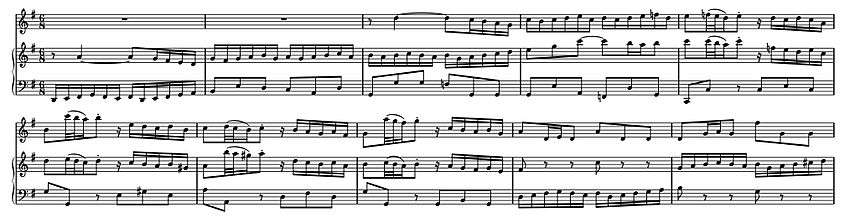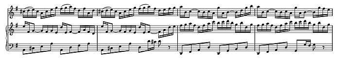 For the remainder of the ritornello the semiquavers pass to the bass, with an arpeggiated version of the motifs for two bars which leads into a short coda and a cadence marking the beginning of the middle section of the movement. The arpeggios in the left hand of the harpischord are accompanied by an adaptation of the syncopated countersubject in the right hand and fragmented quaver responses in the violin.