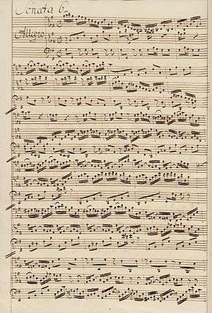 Although it had been believed for some time—and advanced as a theory by Eppstein (1966)—that the sonatas BWV 1014–1019 must have originated in lost trio sonatas for two instruments and continuo, no prior versions have been discovered and it is accepted that only a few movements could have such an origin. The first known source from 1725, in the handwriting of Bach's nephew Johann Heinrich Bach, explicitly specifies an obbligato harpsichord; and, despite the fact that a later version in the hand of Bach's pupil Johann Friedrich Agricola has a marginal "Violin I" at the start of BWV 1014, the scoring of the upper part in the keyboard, especially in the adagio movements BWV 1016/i, BWV 1017/iii and BWV 1018/iii, uses figures that are idiomatic to a keyboard instrument but unsuited to other instruments. Although this compositional style became widespread in the late eighteenth century, in Bach's day it was unusual and innovative. Although all the sonatas are written in trio sonata form, each has its own distinct character—the third is an example of the Sonate auf Concertenart, a sonata written in the style of a concerto.[4] Throughout his life Bach returned to the sonatas to refine and perfect the score, particularly in the last sonata, which survives in three different versions.[5]