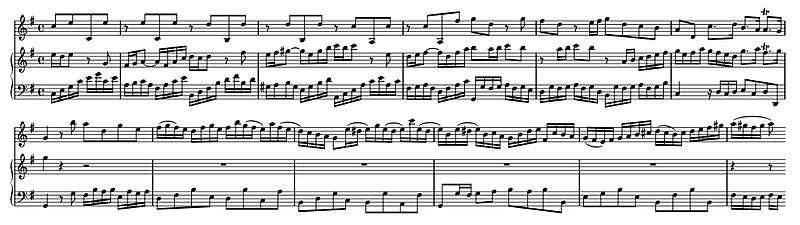 As Watchorn remarks, these momentary interruptions are similar in effect to those in the last movement of the fourth Brandenburg Concerto BWV 1049. After further contrapuntal exchanges between all three parts the music draws to a second halt with a cadence in B minor. It then resumes with a complete recapitulation of the ritornello back in G major.[19]