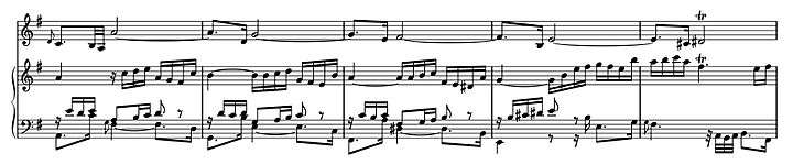 As this episode ends, the entire theme is heard once again but now in the bass line (in a slightly adapted form) with the violin in canon two bars later, resuming its descending sustained notes until the final cadence.[15]