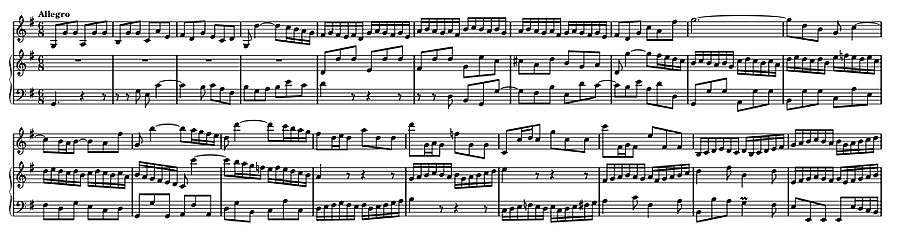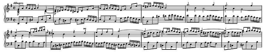 Whatever its origins, the conception of the newly composed Allegro matches that of the five other fugal last movements as well as the symmetry of the opening Allegro. The opening ritornello section is 30 bars long. After the statement of the three-bar fugue subject in the violin, it is taken up in the upper harpsichord part with the semiquaver counter subject in the violin. It is then heard in the bass with the counter-theme in the upper harpsichord. At bar 14 the fugue develops with an inverted version of the opening motif in the violin in counterpoint with semiquaver figures in the left hand of the harpsichord with responses in the right hand.