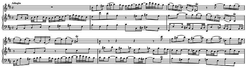 The fourth movement is an Adagio in B minor in common time. Of 21 bars in length, its tonal function is to mediate between the keys of the central and final movements (E minor and G major). The contrapuntal material of themes and counter-themes is shared and exchanged between all three parts; the long phrases in the main theme provide a soaring melody for the violin. The first version of the sonata also had an Adagio in B minor with a similar function but, as Richard Jones comments, the later replacement is "more elaborate and of greater expressive weight and substance." Asmus (1982) gives a detailed analysis of the musical structure of the Adagio, which alternates between two contrasting elements, the interplay between the two underlying the architecture of the movement. The first "arc-shaped" element is the fugue theme—florid, melodic, rhythmically complex and based around the tonic key. It is heard in the first bar in the harpsichord over a rising scale of quavers in the bass. An inverted version of the opening motif appears in the bass line in the third bar as the two upper voices play descending figures semiquaver couplets, which not only complete the melodic line of the fugue theme in the violin part but also provide a counter-theme. The second "rectilinear" element—more severe, chromatic and modulating—is first heard with its own counter-theme in the fifth bar. It is formed of a chain of motifs descending in crotchets, with syncopated rhythms related to those of the fugue theme. Time-wise the first element accounts for the majority of the movement, but the second element governs its tonal structure. Halfway through the movement in bar 11 the tonality reaches the relative major key of D major, but only fleetingly. The melody of the fugue subject and a variant of its completion return in the violin. After two bars of the chromatic syncopated material, the motifs of the fugue subject, broken up between all three voices, lead up to two cadences in F sharp minor. The second element returns in the final two bar coda as the music modulates to the closing cadence in D major, in anticipation of the fifth movement in G major. [18]