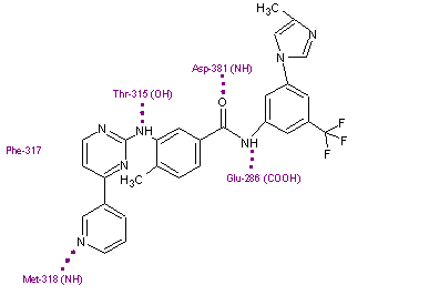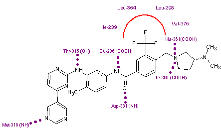 Imatinib binds to Abl domain via six hydrogen bond interactions. This stabilizes the imatinib Bcr-Abl complex and prevents ATP from reaching its binding site.[4][8][10] The hydrogen bonds involve the pyridine-N and backbone-NH of Met-318, the aminopyrimidine and side chain hydroxyl of Thr-315, the amide-NH and side chain carboxylate of Glu-286, the carbonyl and backbone-NH of Asp-381, the protonated methylpiperazine with the backbone-carbonyl atoms of Ile-360 and His-361. Additionally, a number of van der Waals interactions contribute to binding.[8] A hydrophobic pocket is formed by amino acid residues Ile-293, Leu-298, Leu-354 and Val-379 around the phenyl ring adjacent to the piperazinyl-methyl group of imatinib.[10] At the time of its discovery, in the absence of structural information, no clear explanation for the impressive selectivity of imatinib could be found.[6]