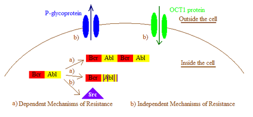 In general, imatinib resistance can be subdivided into Bcr-Abl dependent and independent mechanisms. Bcr-Abl dependent mechanisms include over expression or amplification of the Bcr-Abl gene and point mutations within the Bcr-Abl kinase domain that interfere with imatinib binding. Bcr-Abl independent mechanisms include factors influencing the concentration of imatinib within the cell, for example by alterations in drug influx and efflux and activation of Bcr-Abl independent pathways, such as members of the Src kinase family.[2] Imatinib resistance can also be produced by other mechanisms that will not be mentioned here as the importance of those mechanisms still remain a question due to lack of clinical data.