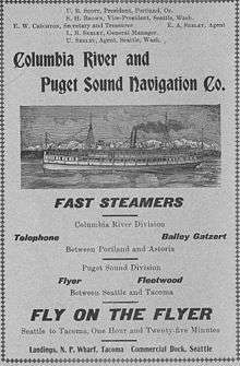 The new company was going to operate steamboats on Puget Sound and on the Columbia River, specifically Flyer, Bailey Gatzert, and Antelope.[22]