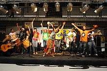 Bate Palmas is a musical youth group from Conjunto Palmeiras under the coordination of the singer-songwriter Parahyba and support of the Banco Palmas. Through its music, the Bate Palmas Company represents the culture and the history of the neighborhood while also representing the principles of the solidarity economy movement through the manufacturing and selling of its own artistic and cultural products, including musical instruments, CD recordings, art workshops, and shows and other artistic performances. Although with great emphasis on percussion, the band is, at times, also accompanied by guitar, electric bass, drums, mandolin, violin, guitar and vocals. The result is always a show full of rhythms with the influence of various types of music such as Coco, Frevo, Bumba-Meu-Boi, Maracatu, Ciranda, Rap, Going, Carimbó, Rock, Reggae, Samba, Baião and others. Bate Palmas performs nationally and takes places in collaboration activities ranging from various group workshops within the State to joint events and presentations with local groups.