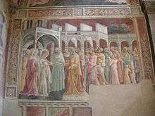 The cycle begins in the lunette on the left wall, portraying the Espulsion of Joachim from the Temple and the Annunciation to Joachim. Below are the Meeting of Joachim and Anne and Anne at the Golden Gate, set in a fanciful Jerusalem with high tower, belfries and other edifices painted in pink. The water of a stream where several youths are drinking is a symbol of Mary as the source of life, while the sea is a hint to her attribute as Stella Maris ("Star of the Sea") and the islet a symbol of virginity. The stories continue in the middle part of the end wall, with the Nativity of the Virgin, following the same scheme of Pietro Lorenzetti's Nativity of the Virgin, with Jesus bathing, and the Presentation of the Virgin at the Temple. The latter scene contains several numerology hints in the steps (three and seven, the number of the Theological virtues and all the Virtues respectively) and in the arches of Solomon's Temple (three like the Holy Trinity).