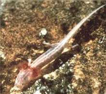 The Barton Springs salamander (Eurycea sosorum) is an endangered lungless salamander that only lives in the habitat of Barton Springs in Austin, Texas, USA.[3] Barton Springs salamanders are average-sized (adults grow to approximately 6.4 centimetres (2.5 in) in total length) and have mottled coloration varying from darkish purple to light yellow.[2]