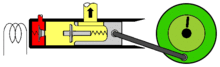 Where a reciprocating action is produced, such as for a rock drill, the valve may be actuated either by inertia of the frame or by the movement of the working piston. As the piston hammers back and forth, it impacts a small tappet, which in turn moves the air valve and so reverses the flow of air to the piston.[3] One form of this, the arc tappet valve, was an important feature of the Ingersoll rock drill, the first successful compressed air rock drill for use in mining and tunneling.[3] This used a valve that rotated in a slight arc, rather than sliding. The valve was double-acting, controlling the air supply for both the power and the return stroke. The innovation that made this valve so reliable, thus successful, was a separate tappet that was actuated by the piston in passing at the middle of the stroke, rather than being hammered by a jarring direct impact of the piston. The mid-stroke actuation also opened the valve passageways earlier, before top dead centre, allowing in air that provided a cushioning effect. This further improved the action of the drill, giving a powerful stroke on the working piston and drill rod, but with less damaging hammering to the frame of the drill.[3]