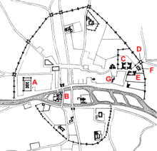 Garrisoned by a captain, a knight, eight squires and ten crossbowmen, the Bastille was encircled with ditches fed by the River Seine, and faced with stone.[12] The fortress had four sets of drawbridges, which allowed the Rue Saint-Antoine to pass eastwards through the Bastille's gates while giving easy access to the city walls on the north and south sides.[13] The Bastille overlooked the Saint-Antoine gate, which by 1380 was a strong, square building with turrets and protected by two drawbridges of its own.[14] Charles V chose to live close to the Bastille for his own safety and created a royal complex to the south of the fortress called the Hôtel St. Paul, stretching from the Porte Saint-Paul up to the Rue Saint-Antoine.[15][upper-alpha 2]