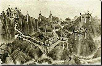 By the middle of March nine separate Chinese military commands were massed close up to the Tonkinese border around the enormous entrenched camps of Yen Cua Ai and Bang Bo. There were six main Chinese concentrations. The entrenched camp of Yen Cua Ai was held by ten battalions under the command of Feng Zicai (冯子材) and a slightly smaller force under the command of Wang Xiaochi (王孝祺). These two commands numbered perhaps 7,500 men in all. Two to three kilometres behind Yen Cua Ai, around the village of Mufu, lay the commands of Su Yuanchun (苏元春) and Chen Jia (陳嘉), perhaps 7,000 men in all. Fifteen kilometres behind Mufu the commands of Jiang Zonghan (蔣宗汉) and Fang Yusheng (方友升), also 7,000 strong, were deployed around the village of Pingxiang (known to the French from its Vietnamese pronunciation as Binh Thuong). The commander of the Guangxi Army, Pan Dingxin (潘鼎新), lay at Haicun, 30 kilometres behind Mufu, with 3,500 men. Fifty kilometres to the west of Zhennanguan, 3,500 men under the command of Wei Gang (魏刚) were deployed around the village of Aiwa. Finally, fifteen kilometres to the east of Zhennanguan, just inside Tonkin, Wang Debang (王德榜) occupied the village of Cua Ai with 3,500 men.[11]