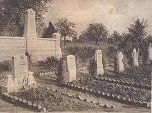 White crosses and Stars of David mark 2,289 graves, 250 for unknown service members, and the names of 1,060 missing men adorn the wall of a memorial chapel. Visitors also stop at the nearby German cemetery where 8,625 men are buried; 4,321 of them—3,847 unknown—rest in a common grave. The German cemetery was established in March 1922, consolidating a number of temporary sites, and includes men killed between the Aisne and the Marne in 1918, along with 70 men who died in 1914 in the First Battle of the Marne.[4][15]