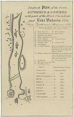 The French in 1755 had the only large naval vessels on Lake Ontario, and moved freely about the lake, between Fort Niagara in the west and Fort Frontenac at the head of the Saint Lawrence River. In March 1756 they launched a winter attack on Fort Bull on Wood Creek. Fort Bull was a key depot on the supply line for the Oswego forts, which was the waterway leading up the Mohawk River and crossing over to the Oswego River watershed. In the successful attack, they destroyed many provisions intended for the Oswego garrison, and effectively ruined Shirley's plan to attempt the expedition against Fort Niagara in 1756.[3] Following orders of the Governor of New France, Pierre François de Rigaud, Marquis de Vaudreuil-Cavagnal, in May 1756 French and Indian raiding parties under the command of Louis Coulon de Villiers began harassing the Oswego garrison from a camp on Henderson Bay (south of present-day Sackett's Harbor, New York).[4]