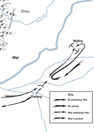 Pang Juan had moved to Malingdao, and when he saw the warning message, he paid no attention, instead ordering the words to be scraped off. The army advanced when suddenly, a flush of Qi troops surrounded the Wei. In the darkness, Qi archers managed to shoot down many of the Wei soldiers, before the rest of soldiers charged in. The Wei troops did not expect Qi to still have so many troops under their command and were quickly overrun. Pang Juan, sensing his end was near, committed suicide. In some versions, Pang Juan was among the first of his troops to be shot to death.