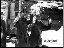 A documentary film, Moscow Strikes Back, (Russian: Разгром немецких войск под Москвой, "Rout of the German Troops near Moscow"), was made during the battle and rapidly released in the Soviet Union. It was taken to America and shown at the Globe in New York in August 1942. The New York Times reviewer commented that "The savagery of that retreat is a spectacle to stun the mind."[87] As well as the Moscow parade and battle scenes, the film included images of German atrocities committed during the occupation, "the naked and slaughtered children stretched out in ghastly rows, the youths dangling limply in the cold from gallows that were rickety, but strong enough."[87]