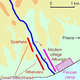 In the summer of 479 BC, the Greeks assembled a huge army (by contemporary standards), and marched to confront Mardonius at the Battle of Plataea. At the same time, the allied fleet sailed to Samos, where the demoralised remnants of the Persian navy were based. The Persians, seeking to avoid a battle, beached their fleet below the slopes of Mycale, and, with the support of a Persian army group, built a palisaded camp. The Greek commander Leotychides decided to attack the Persians anyway, landing the fleet's complement of marines to do so.