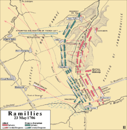 Neither opponent expected the clash at the exact moment or place where it occurred.[24] The French moved first to Tienen, (as if to threaten Zoutleeuw, abandoned by the French in October 1705), before turning southwards, heading for Jodoigne – this line of march took Villeroi’s army towards the narrow aperture of dry ground between the Mehaigne and Petite Gheete rivers close to the small villages of Ramillies and Taviers; but neither commander quite appreciated how far his opponent had travelled. Villeroi still believed (on 22 May) the Allies were a full day’s march away when in fact they had camped near Corswaren waiting for the Danish squadrons to catch up; for his part, Marlborough deemed Villeroi still at Jodoigne when in reality he was now approaching the plateau of Mont St. André with the intention of pitching camp near Ramillies (see map at right).[24] However, the Prussian infantry was not there. Marlborough wrote to Lord Raby, the English resident at Berlin: "If it should please God to give us victory over the enemy, the Allies will be little obliged to the King [Frederick] for the success."[25]