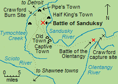 77. Butterfield, Expedition against Sandusky, 224. Several brief accounts of the expedition state that it was Crawford who "made a stand" with his men at the Battle of Olentangy and that his capture took place after this skirmish (Boatner, "Crawford's Defeat", 288; Belue, "Crawford's Sandusky Expedition", 418; Miller, "William Crawford", 312). However, the detailed accounts of Butterfield and Brown make it clear that Crawford went missing the night before and was not present during the battle. In his journal, Rose wrote that "Mr. William Crawford" became separated during the Olentangy battle, but he was referring to the younger William Crawford, a nephew of the colonel; Rosenthal, Journal, 153.