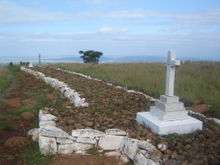 The British climbed up the hill at night and in dense mist.[10] They surprised the small Boer piquet and drove them off the kop at bayonet point. Of the 15 men in the Boer piquet, one was mortally wounded and his grave lies on the hill to this day.[11] Ten British soldiers were wounded in the charge.[1] The surviving Boers retreated down the hill to their camp waking up their fellow Boers by screaming "Die Engelse is op die kop." (The English are on the hill.). A half-company of British sappers began to entrench the position with a mere 20 picks and 20 shovels (while almost 1,000 soldiers stood around idle) and Woodgate notified Warren of the successful capture of the hilltop.[12]