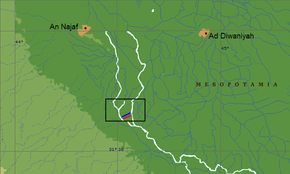 According to modern geography the battlefield lies 25 miles south-east of the Iraqi city of Najaf, and about 4 miles south-west of modern Ash Sinafiyah.[11]