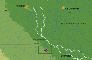 The Sassanid commander, Andarzaghar, deployed in the centre of this plain, facing south-east, with the western ridge behind them, and their left resting on the northeastern ridge. Khalid formed his army facing the Sassanid army. The center of the battlefield was about two miles southeast of present, Ain-ul-Muhari, 35 miles southeast of present, Najaf, and six miles southeast of present Ash Sinafiyah.[1] The Sassanid cavalry was heavily outnumbered by the Muslim cavalry. It was mainly composed of heavy cavalry and was stationed behind the wings, guarding the flanks. Khalid had 5,000 cavalry and 10,000 infantry with him. Knowing that his cavalry outnumbered the Persian cavalry, he designed his grand manoeuvre. His plan was the total encirclement of the Persian army using his superior cavalry. Rather than launching his cavalry via the flanks (as Hannibal had done in the Battle of Cannae), Khalid made use of the terrain, and positioned a part of the cavalry behind the western ridge of the battlefield. Khalid divided his cavalry into two regiments of about 2,000 men each, sending them behind the western ridge the night before the battle. They were instructed to attack the Persian rear at Khalid’s signal.