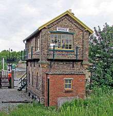 The signal box and the station are actually in Aiskew by Parish boundary definitions (the traditional parish boundary was Bedale Beck).[4] However, the signal box was given Grade II Listed Status in February 1993 and as such, it is now in the Bedale Conservation area.[5] The box is believed to have been designed by G T Andrews.[6]