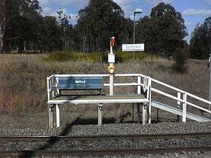 Belford railway station is a closed station on the Main North railway line. It served the settlement of Belford in the Hunter Region of New South Wales, Australia. Services were provided by CityRail's Hunter line until 4 September 2005, when the station was closed for safety reasons.[1]