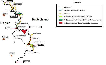 After the war, Belgium had gradually withdrawn her territorial claims. According to the Allied order of 26 March 1949, several populated places and the Vennbahn, which was of special interest for Belgium, should be handed over.[2] However, on 15 April 1949, a sudden change of mind occurred in Belgium.[3] The Belgian government officially declared that it waived the claims to most places and territories that been assigned to Belgium. This waiver was allegedly not the result of the ongoing protest by the state government of North Rhine-Westphalia, but an insight into the inefficiency of the boundary corrections by Belgium. Because establishing the Vennbahn railway would require huge resources over the years, as had been assessed by Belgium, it was decided to refrain from adding adjacent villages to the military administration. Moreover, the Belgian government did not see any support from a majority of the Belgian population for these measures.[2]