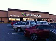 Belle Foods, LLC was a family-owned chain of American supermarkets headquartered in Birmingham, Alabama.[1] The company had a relatively short lifespan. It began operating its rebranded Bruno's and Food World and Piggly Wiggly Stores on July 1, 2012, but filed for bankruptcy just one year later.[2] Before owners Bill White and Jeff White purchased the stores from Southern Family Markets in mid-2012, the 57-store grocery chain employed approximately 3,000 people.[3]