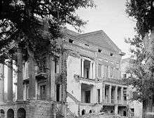 Belle Grove, also known as Belle Grove Plantation, was a plantation and elaborate Greek Revival and Italianate-style plantation mansion near White Castle in Iberville Parish, Louisiana. Completed in 1857, it was one of the largest mansions ever built in the South, surpassing that of the neighboring Nottoway. Nottoway is often cited as the largest antebellum plantation house remaining in the South.[1][2] The masonry structure stood 62 feet (19 m) high and measured 122 feet (37 m) wide by 119 feet (36 m) deep, with seventy-five rooms (including a jail cell) spread over four floors.[1]