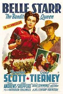 Belle Starr is a 1941 American drama film directed by Irving Cummings and starring Randolph Scott, Gene Tierney, Dana Andrews, and Shepperd Strudwick. Written by Lamar Trotti and based on a story by Niven Busch and Cameron Rogers, it was produced by Kenneth Macgowan for 20th Century Fox, and shot in Technicolor.[1]