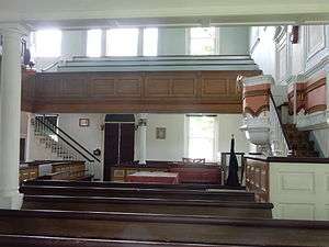 The second church built on the site, the Old Belleman's church, was built in 1814 and added to the National Register of Historic Places in 1973. While it has not been updated for electricity and plumbing, the Georgian-style church features many styles and motifs not seen in many 19th century rural churches. The church embellishes many of the fine points of architecture such as an elaborate cornice, Palladian windows, arched windows, detailed doorways and a gallery. Particular focal points are the wineglass pulpit and a hand-pump organ. The building is used several times per year during warmer months, for Sunday services, weddings, and annual "Hymn Sings" and a service in the Pennsylvania German dialect.[2]