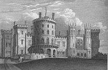 The castle was rebuilt in the romantic Gothic Revival style to designs by James Wyatt between 1799 and 1816, but on 26 October 1816 it was almost destroyed by a fire.[10] The loss was estimated at £120,000 (equivalent to £8,280,000 in 2015),[9] including pictures by Titian, Rubens, Van Dyck and Reynolds.