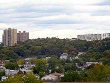 Bergenwood is a long narrow district of North Bergen, New Jersey in the northern central part of the township between Kennedy Boulevard and Tonnelle Avenue,[1] characterized by the steep slopes on the west side of the Hudson Palisades as they descend to the New Jersey Meadowlands. It is here that North Bergen's distinction of being the US municipality with the most hills, second only to San Francisco,[2] is evident. The unusual topography also makes for another oddity. The north-south streets in Bergenwood (and on much of the western slope of North Bergen) keep their names (Newkirk, Durham, Liberty, Columbia, and Grand among them) but often do not run contiguously, in some cases are broken up into seven or eight sections. (Addresses are taken from the numbered east-west streets which more or less follow the urban grid of North Hudson municipalities.)