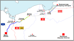 With the end of the Cold War, and particularly with Poland joining the European Union, increasing thought has been given to reconstructing the road as part of the European highway system. In the 1990s a 14 km long segment near the western Polish border was incorporated into the new A6 Autostrada (highway). A further 7 km, to the junction with National Road 10, was being restored and was scheduled to open for traffic in August 2007. An additional 8 km is to be upgraded at some future date and redesignated as A6. The section between Elbląg and the border with Russia was completely reconstructed and opened as an express road, S22, in September 2008. In the course of the upgrade, the new modern carriageway was built in the space left for the second carriageway during original construction. At the same time, the original concrete carriageway was demolished almost along the entire length of the route, and only a few traces of it remain. All of the remaining original overpasses and bridges were demolished and replaced with modern works. Thus very few traces of the original German autobahn can be seen. Other part of the Berlinka are incorporated into voivodeship road 142, and expressroad 6/3. In the Russian Kaliningrad Oblast, it is incorporated into road P516.