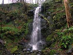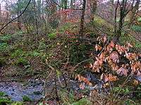 A rocky glen runs up from Monkcastle with a significant waterfall and a listing as part of a Scottish Wildlife Trust local site for nature conservation. The glen was partly formed from quarrying work for freestone.[32] A previous course of the Monkcastle Burn can still be followed and this probably resulted from the quarrying intruding into the original course of the burn at the head of the glen resulting in a watefall and the burn then following the bed of the glen itself. The geology consists of Carboniferous limestone, macroporphyritic basalt, and an overlay of basalt and boulder clay. The quarry workers are thought to have made used of Old Monkcastle as office space for storage, etc. The OS maps show that quarrying had ceased by the start of the 20th century.[33]
