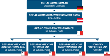 bet-at-home.com AG is based in Düsseldorf and acts as the holding and is responsible for the listing of bet-at-home.com’s shares. The company holds 100% of bet-at-home.com Entertainment GmbH. The company’s Linz office is primarily responsible for the ongoing technology transfer within the company and the internally developed software. The activities in Malta are operated under bet-at-home.com Holding Ltd and its 100% owned subsidiaries hold the Maltese gaming licenses for casino, poker and sports betting, that have been issued by the Malta Gaming Authority (MGA).[28][29]