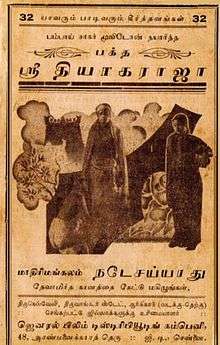 Bhaktha Sri Thyagaraja (also known as Sri Thiagaraja Charitham) is a 1937 Indian Tamil-language biographical film written by M. P. Sundararajan and directed by Virendra Desai. Produced by Sagar Movietone, and based on the life of the Carnatic musician Tyagaraja, Mathirimangalam Natesa Iyer, Kamala and Seetha appeared in the leading roles. The film's success at the box office was largely attributed to its music.[2]