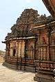 The outer wall of the temple has projections and recesses creating niches. In these niches are miniature decorative towers in relief (called aedicula or turrets), the execution of which evolved during the Later Chalukya rule. The vesara style aedicula are supported by double pilasters while the dravida (south Indian) style aedicula are supported by single pilasters. The art historian Percy Brown calls the Later Chalukyan style of wall decoration "exceptionally well rendered", and according to Kamath, the miniature towers are wrought in a "most artistic refrain".[5] Each tier of the superstructure has a kirtimukha (gargoyle like face). Below each kirtimukha, is a relief of a deity such as the Nataraja or Maheshvara (both forms of the Hindu god Shiva). Worthy of mention is the ornate relief on the lintel and door jamb at the entrance to each sanctum (garbhagriha) which exhibit Saiva dvarapalas ("guardians" to a shrine of the god Shiva) flanked by female umbrella (chauri) bearers. Facing the west sanctum is a small sculpture of Nandi the bull. There are sculptures of various deities from the Hindu pantheon in the niches in the interior wall of the temple, such as Ganesh (elephant headed god of "beginnings" in Hinduism), Mahishasuramardhini (a form of Durga) and the Saptamatrika (the seven Hindu goddesses). The ceiling in the common hall is supported by four polished lathe turned pillars, which according to Kamath is also a characteristic feature of Western Chalukya temples.[4]