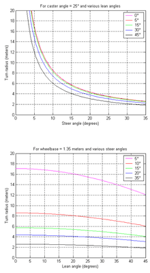 where is the approximate radius, is the wheelbase, is the lean angle, is the steering angle, and is the caster angle of the steering axis.[9]