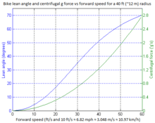 For example, a bike in a 10 m (33 ft) radius steady-state turn at 10 m/s (36 km/h, 22 mph) must be at an angle of 45.6°. A rider can lean with respect to the bike in order to keep either the torso or the bike more or less upright if desired. The angle that matters is the one between the horizontal plane and the plane defined by the tire contacts and the location of the center of mass of bike and rider.