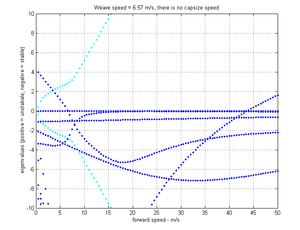 Once a turn is established, the torque that must be applied to the steering mechanism in order to maintain a constant radius at a constant forward speed depends on the forward speed and the geometry and mass distribution of the bike.[11][23] At speeds below the capsize speed, described below in the section on Eigenvalues and also called the inversion speed, the self-stability of the bike will cause it to tend to steer into the turn, righting itself and exiting the turn, unless a torque is applied in the opposite direction of the turn. At speeds above the capsize speed, the capsize instability will cause it to tend to steer out of the turn, increasing the lean, unless a torque is applied in the direction of the turn. At the capsize speed no input steering torque is necessary to maintain the steady-state turn.