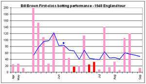 Nevertheless, Brown was successful in the tour matches when he played as an opener. He ended the tour with eight centuries and a total of 1,448 first-class runs at an average of 57.92,[69] behind only Bradman, Hassett and Morris in the runs and averages, with a highest score of 200 against Cambridge University.[2][70] Brown's tally of eight centuries was second only to Bradman,[68] and took his tally on English soil to 18 first-class tons.[43] Excluding the matches against Worcestershire, the MCC and the first two Tests, in which Brown had scored 25, 26, 17, 24 and 32 batting in the middle order while Barnes and Morris opened,[6][20][21][25] Brown scored 1,324 runs at 66.20 while opening in the other matches, which would have put him in a clear fourth place on the batting averages.[68] Following his omission from the Test team midway through the tour, Brown batted in a slow and conservative manner in order to score more runs and regain his position, much to the chagrin of the crowds.[62]