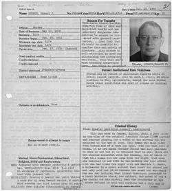 Known as Prisoner #1853-M, Stroud was one of the most violent prisoners at McNeil Island, frequently feuding with fellow inmates and staff, and was also prone to many different physical ailments.[8] Stroud reportedly stabbed a fellow prisoner who had reported him for stealing food from the kitchen.[7] He also assaulted a hospital orderly who had reported him to the prison administration for attempting to obtain morphine through threats and intimidation, and had also reportedly stabbed another fellow inmate who was involved in the attempt to smuggle the narcotics. On September 5, 1912, Stroud was sentenced to an additional six months for the attacks, and was transferred from McNeil Island to the federal penitentiary in Leavenworth, Kansas. On March 26, 1916,[5] after being there six months, Stroud was reprimanded by cafeteria guard Andrew F. Turner for a minor rule violation that would have annulled Stroud's visitation privilege to meet his younger brother, whom he had not seen in eight years. With a six-inch shiv, Stroud stabbed Turner through his heart.[9][7]