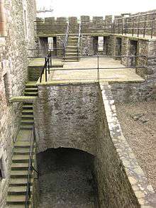 Between 1534 and 1540, a programme of fortification was carried out under the direction of the King's Master of Works, Sir James Hamilton of Finnart.[7] Finnart, the illegitimate son of the Earl of Arran, was an expert in artillery fortification. Having spent time in Europe studying the subject, he designed his own castle at Craignethan in Lanarkshire as a showcase for his ideas.[8] At Blackness, he introduced technological innovations including a complex entrance with a caponier, one of only three surviving in Scotland (the others being at Craignethan and Stirling Castle). The caponier, a passage within the external wall of the entrance, allowed defenders to fire into the entrance area, at the backs of any attackers who had breached the gate. The curtain wall was thickened on the inside to the south and east, from 1.5 m (4.9 ft) to over 5 m (16 ft) in places, and gun ports were opened up. The south wall was also heightened to enclose the new south tower.[9]