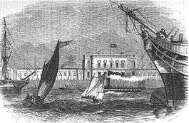 The station was designed by architect William Tite in an ornate Italinaite style.[1] It opened on 6 July 1840 with services connecting with a ferry service to Gravesend, Kent. In March 1926 the London and North Eastern Railway and Port of London Authority announced passenger services would be withdrawn on 30 June 1926. However, with the start of the national general strike services were suspended early on 3 May 1926, and never resumed.[2]