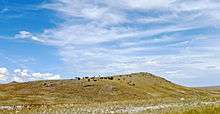 The Bleu Horses is a set of 39 horse sculptures made primarily of steel and permanently installed on a hillside off Highway 287 just north of Three Forks, Montana.[1] The name of the installation is taken from a color of horse known as a blue roan, though the live animal color is actually closer to gray.[2] The horse sculptures were created and set up by artist Jim Dolan of Belgrade, Montana, who previously had created other complex outdoor sculptures over the past 30 years, including a herd of elk placed upon the lawn of a bank in Bozeman, and a fly fisherman sculpture in Ennis.[3] He also donated four of his sculptures at Montana State University (MSU), and installed a flock of geese in the terminal of Bozeman Yellowstone International Airport.[4]