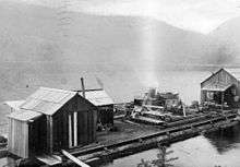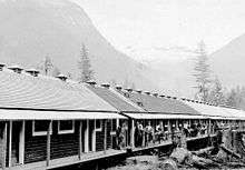 Exterior of workers' huts at 120 man logging camp, Kingcome River